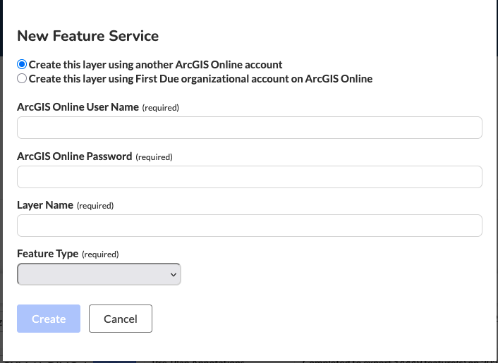 Log in with your AGOL credentials and select the given feature types. If you choose the 2nd radio button of using the FirstDue organization you will need to work with FirstDue to get the layer shared to a Tablet Command shared group.